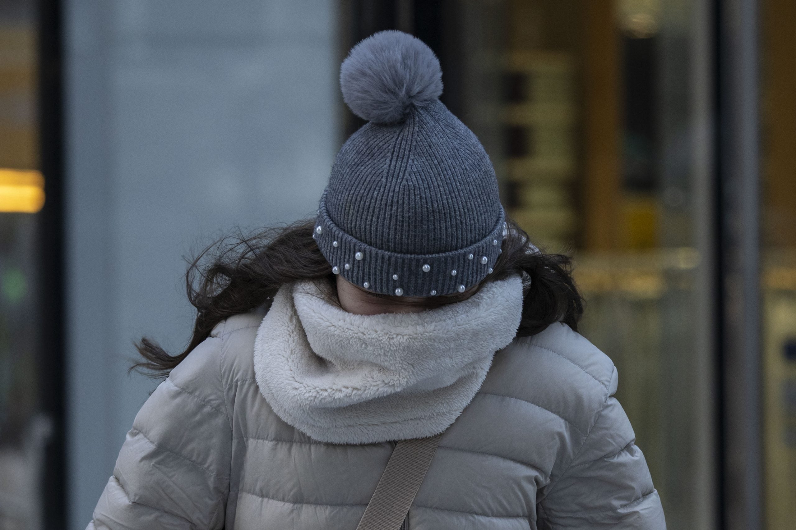 A person walks in freezing cold temperatures in New York City on January 17, 2024.