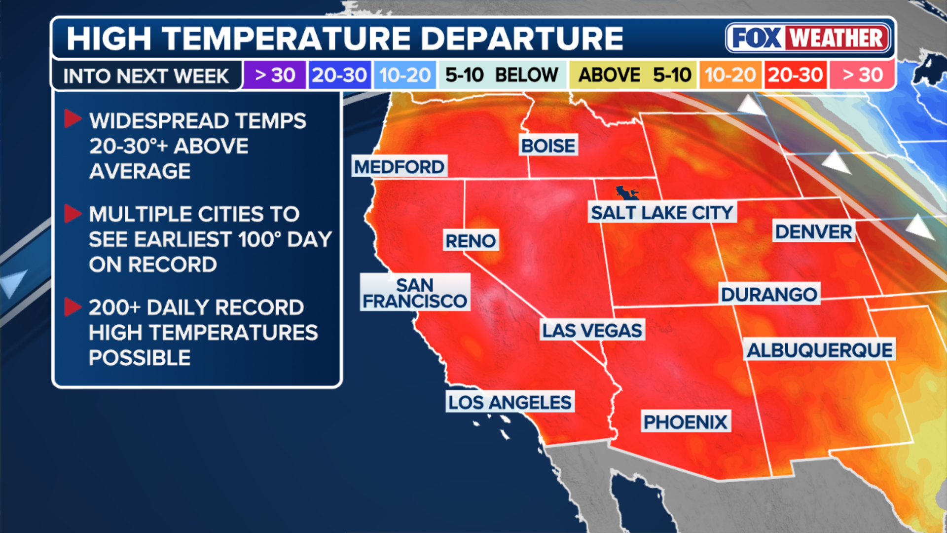 Cities like Las Vegas and Phoenix typically see temperatures in the low-to-mid 70s this time of year, but forecasts show highs will climb into the 90s during the weekend into early next week.