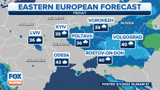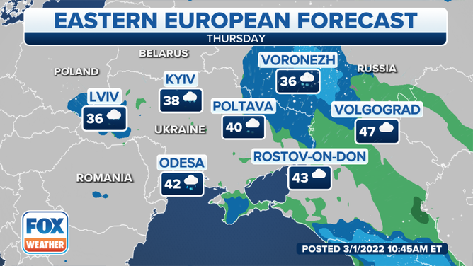In the Ukrainian capital of Kyiv, temperatures are forecast to remain in the mid- to upper-30s throughout the week. Snow and rain are expected to fall in the region, but Thursday should be cloudy and dry. Some wintry precipitation is expected to move back into the area by Friday.