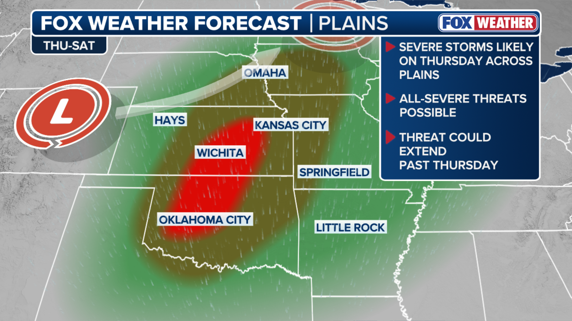 Severe storms reload late this week across portions of the Plains. From Oklahoma north into parts of the Upper Midwest, renewed threats of large hail, damaging winds and tornadoes will all be possible by Thursday. Latest:
