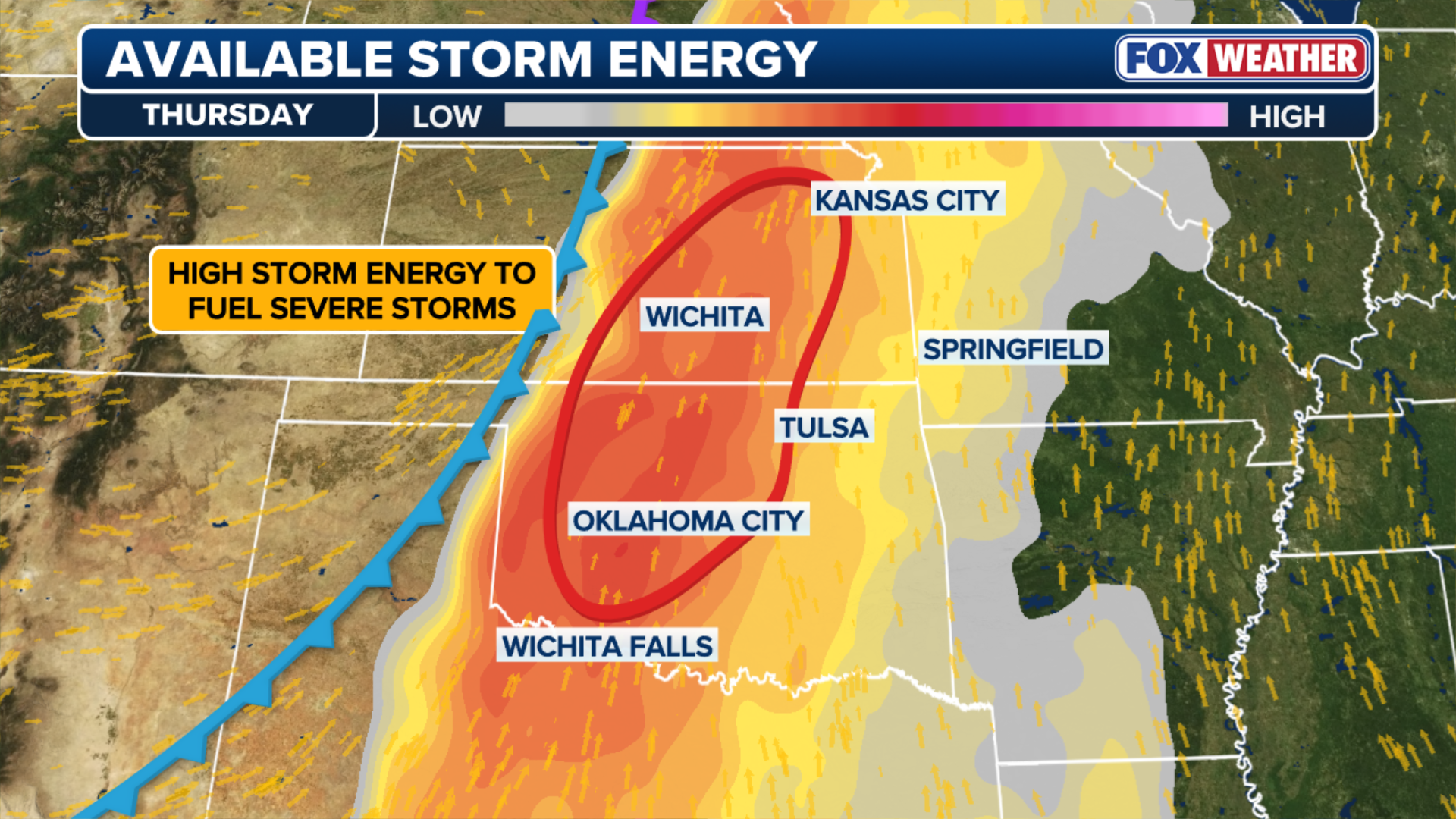 That said, the primary focus for storms to spark on Thursday will be along a sharpening dryline expected to develop across western Oklahoma and Kansas.