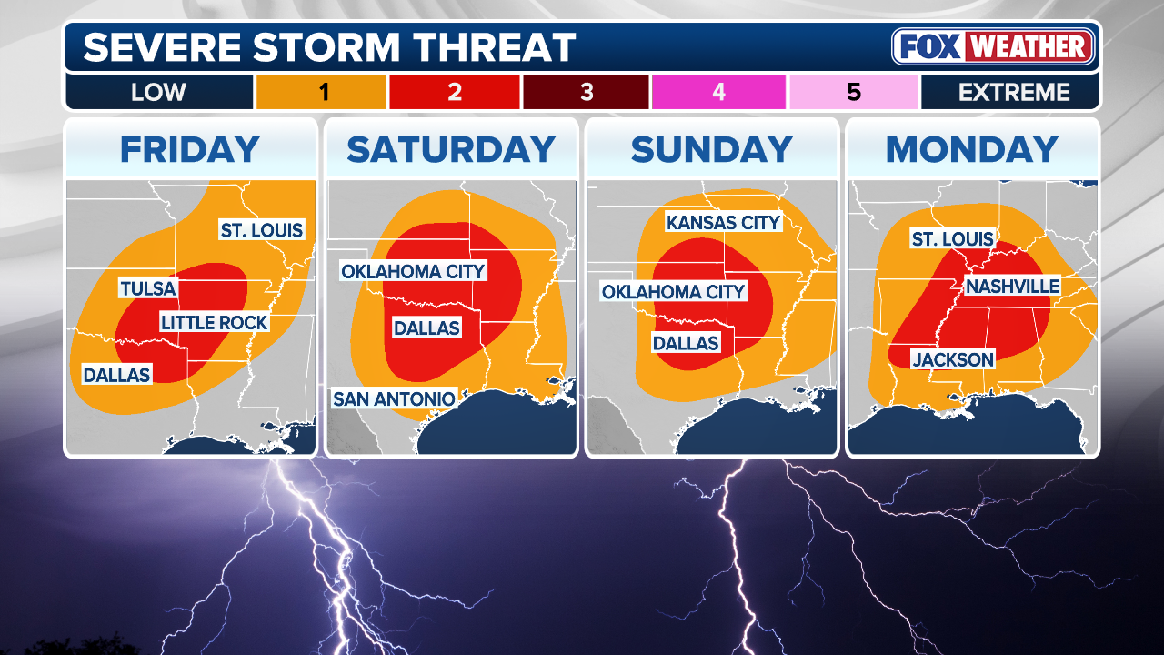 Cities included in Friday's threat area include Dallas, Shreveport and Little Rock, according to the FOX Forecast Center.