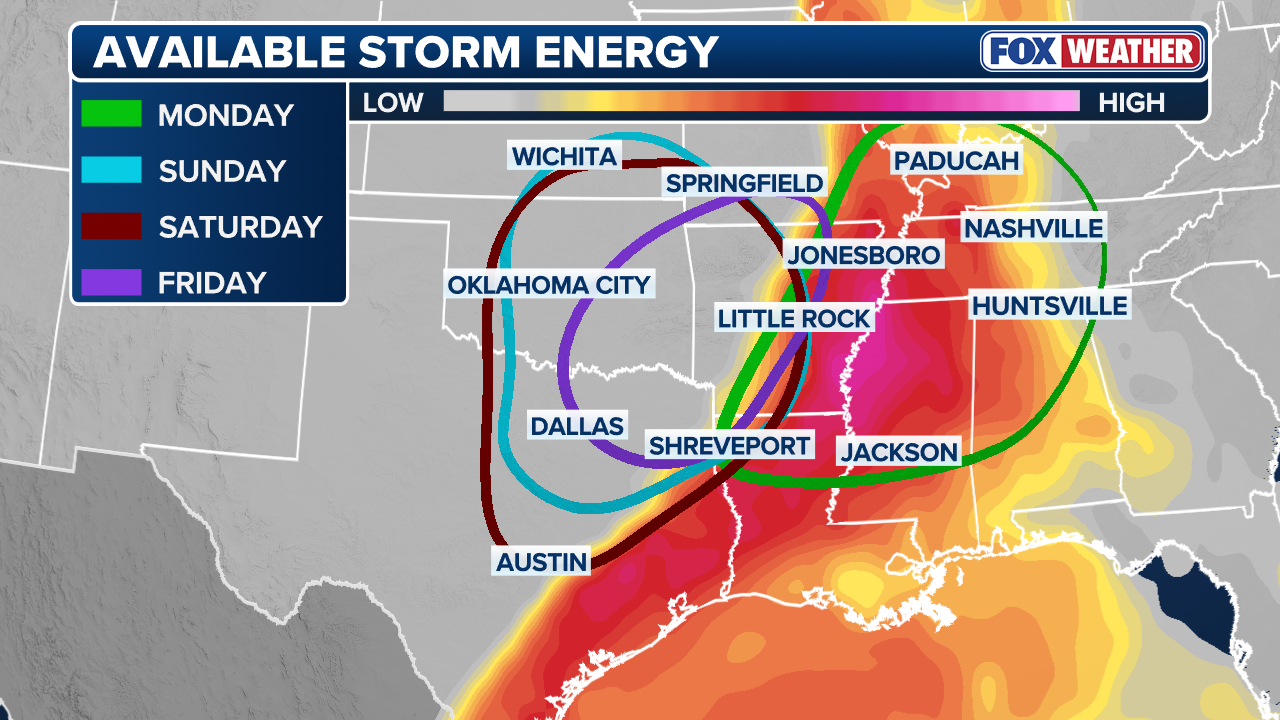The FOX Forecast Center said Monday looks to be the most significant day, with severe storms that could bring large hail, thunderstorms and possible tornadoes to the South.