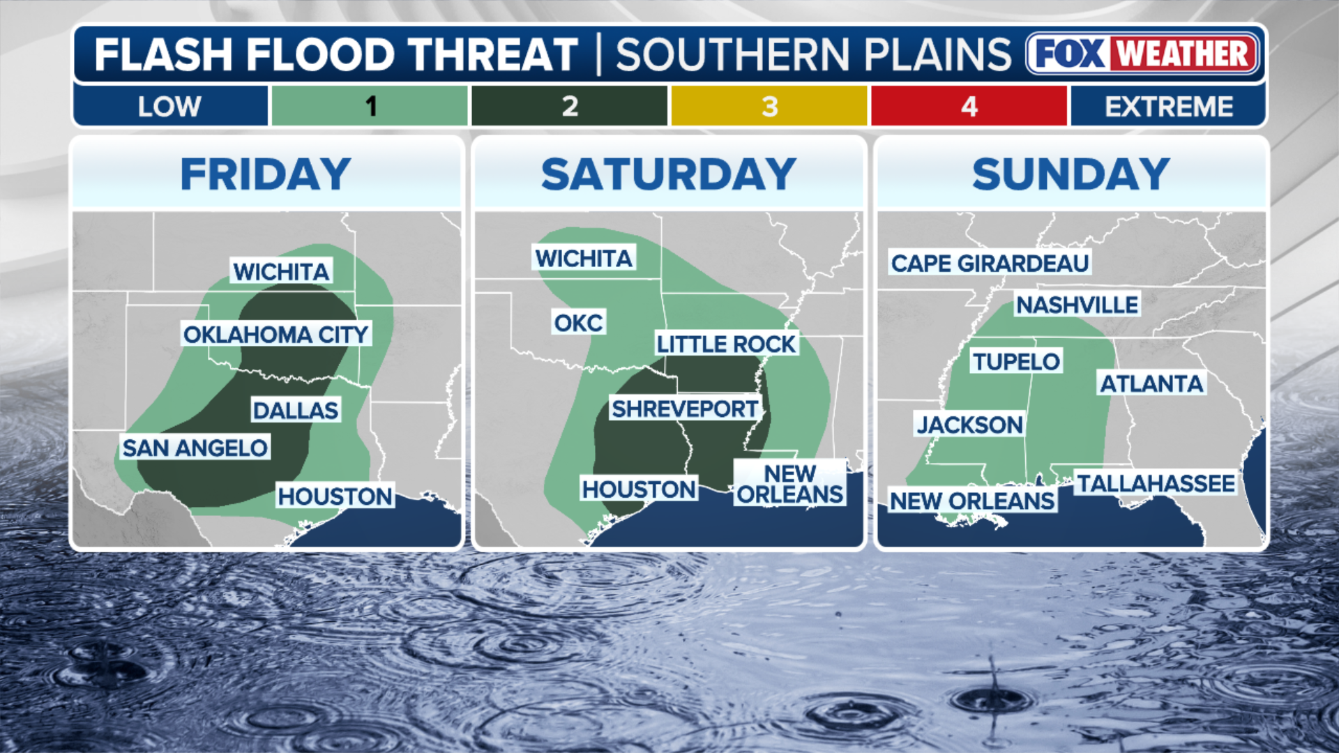 Meanwhile, Oklahoma City and Dallas are included in Friday's flash flood threat, as rain produced by these storms will be enhanced by tropical moisture from the Gulf.
