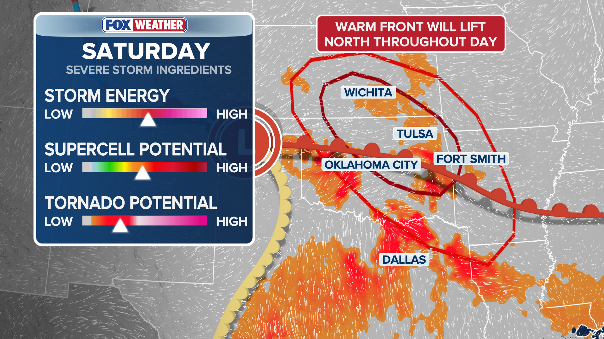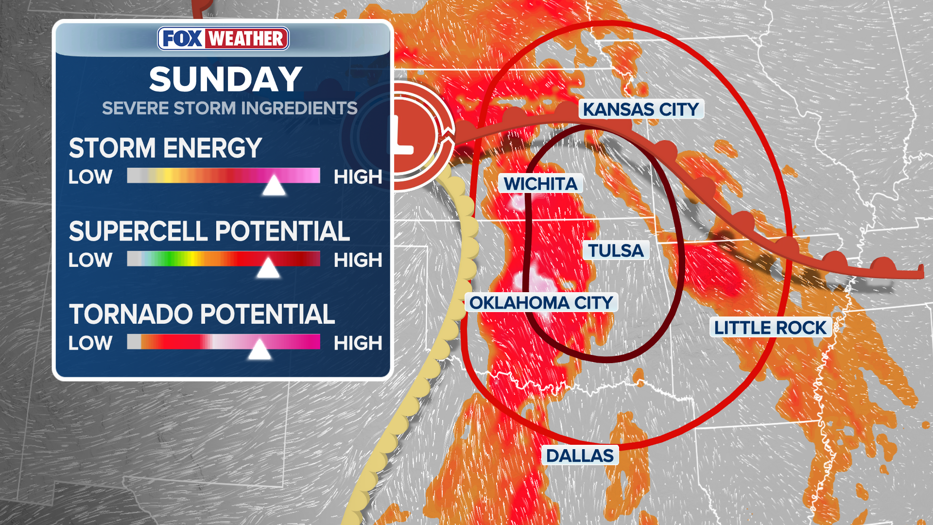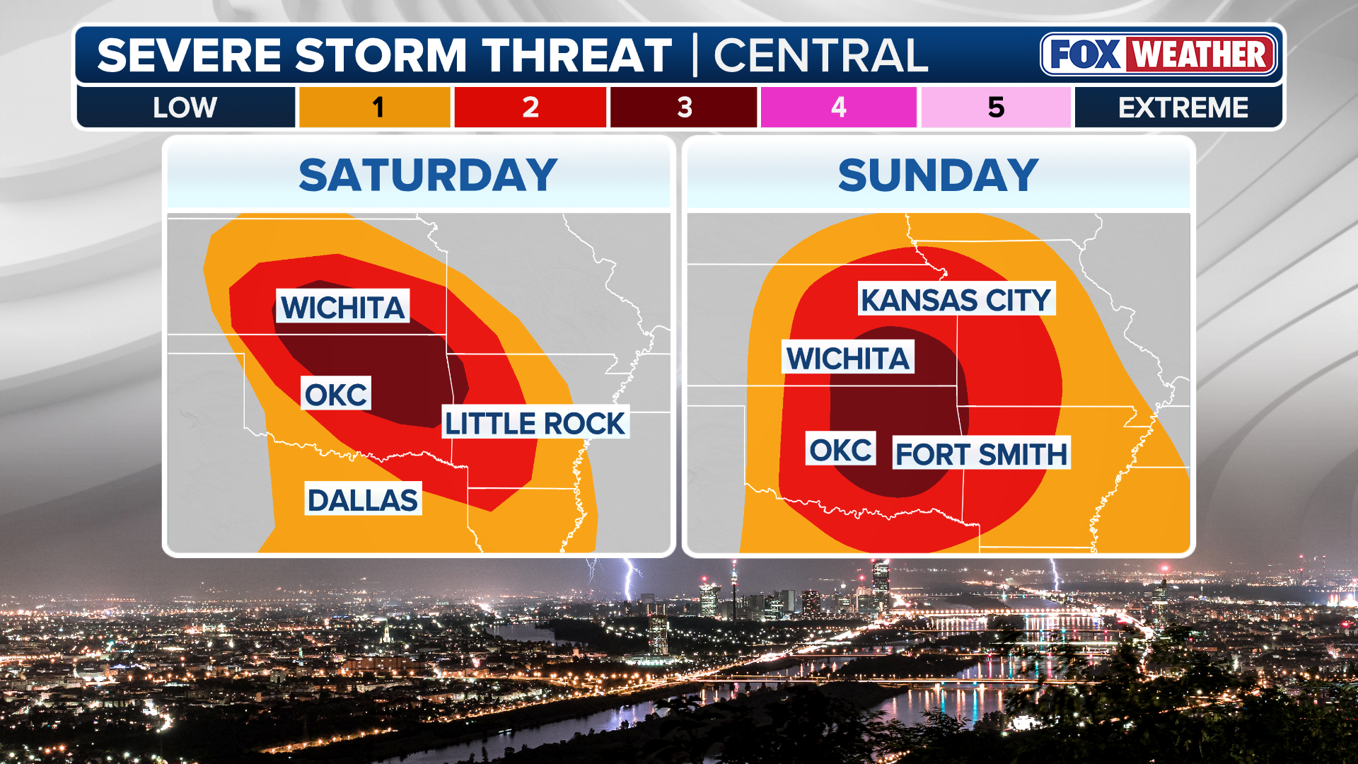 A Level 3 of 5 severe storm risk is already in place from central Oklahoma into southern Kansas, including Oklahoma City and Wichita.