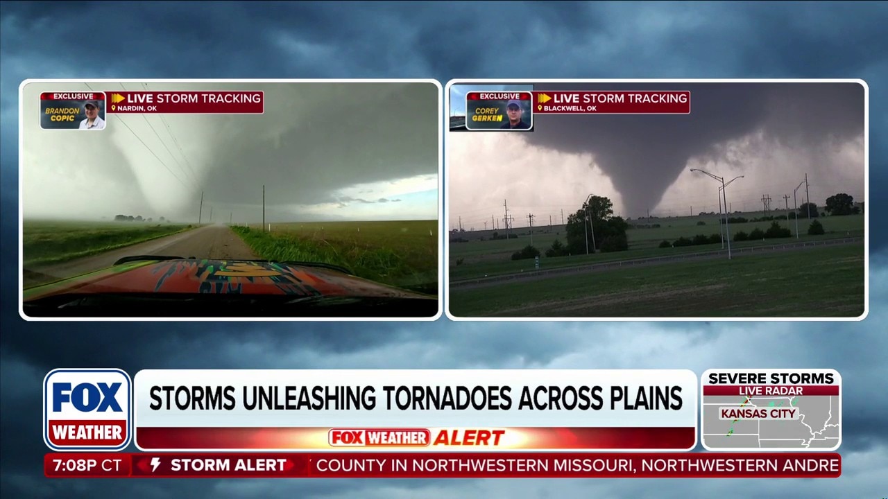 FOX Weather Exclusive Storm Trackers Brandon Copic and Corey Gerken intercepted two tornadoes at the same time in Oklahoma live on air Thursday night.