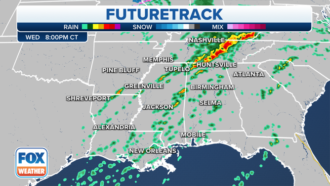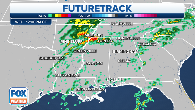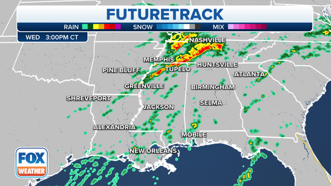 Ongoing showers and thunderstorms from northeast Texas will move eastward into the Lower Mississippi Valley and the Southeast Wednesday afternoon.