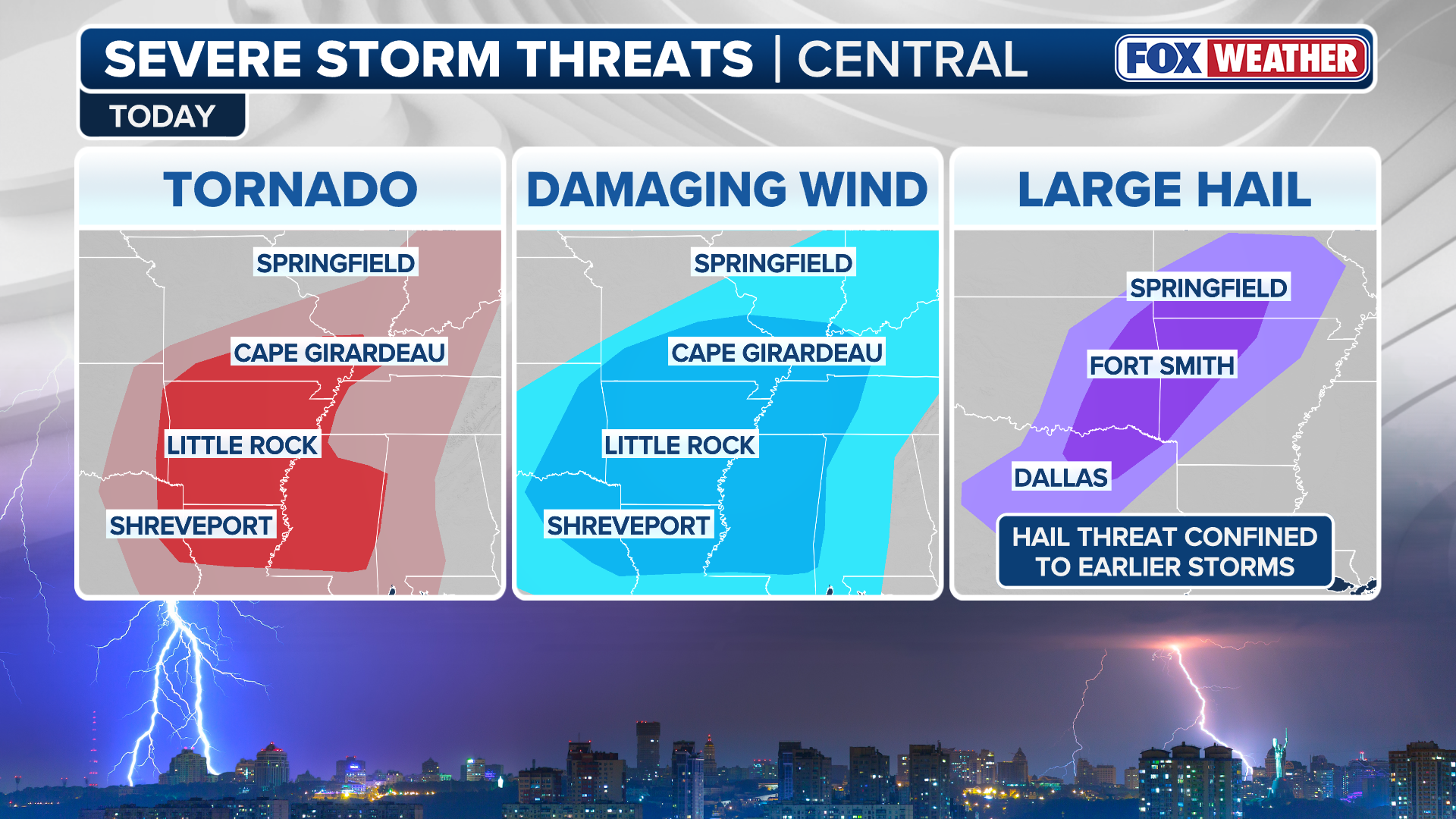 "We've got a big cold front moving through the nation's midsection and conditions are expected to become more unstable as we go throughout the day with all severe weather threats on the board," said FOX Weather Meteorologist Nick Kosir. "Some of these areas… Little Rock, Fort Smith (Arkansas) and some of the spots just to the south are a bit in the bullseye when it comes to the potential for severe weather."