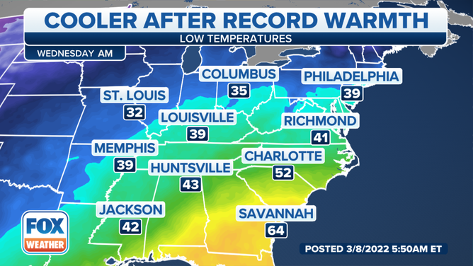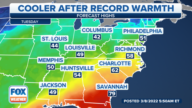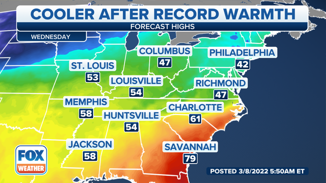 Temperatures will rebound across much of the South on Wednesday as the second shot of cold air moves into the northern Rockies and Northern Plains.