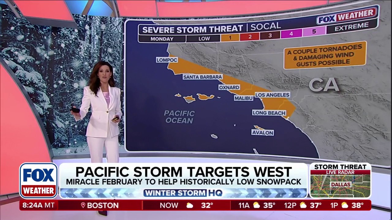 A low-level severe weather threat goes into effect Monday for southern California as rounds of storms bring heavy rain and feet of snow to the West Coast. The National Weather Service said the storm could be extremely dangerous, with damaging winds and some tornadoes possible.