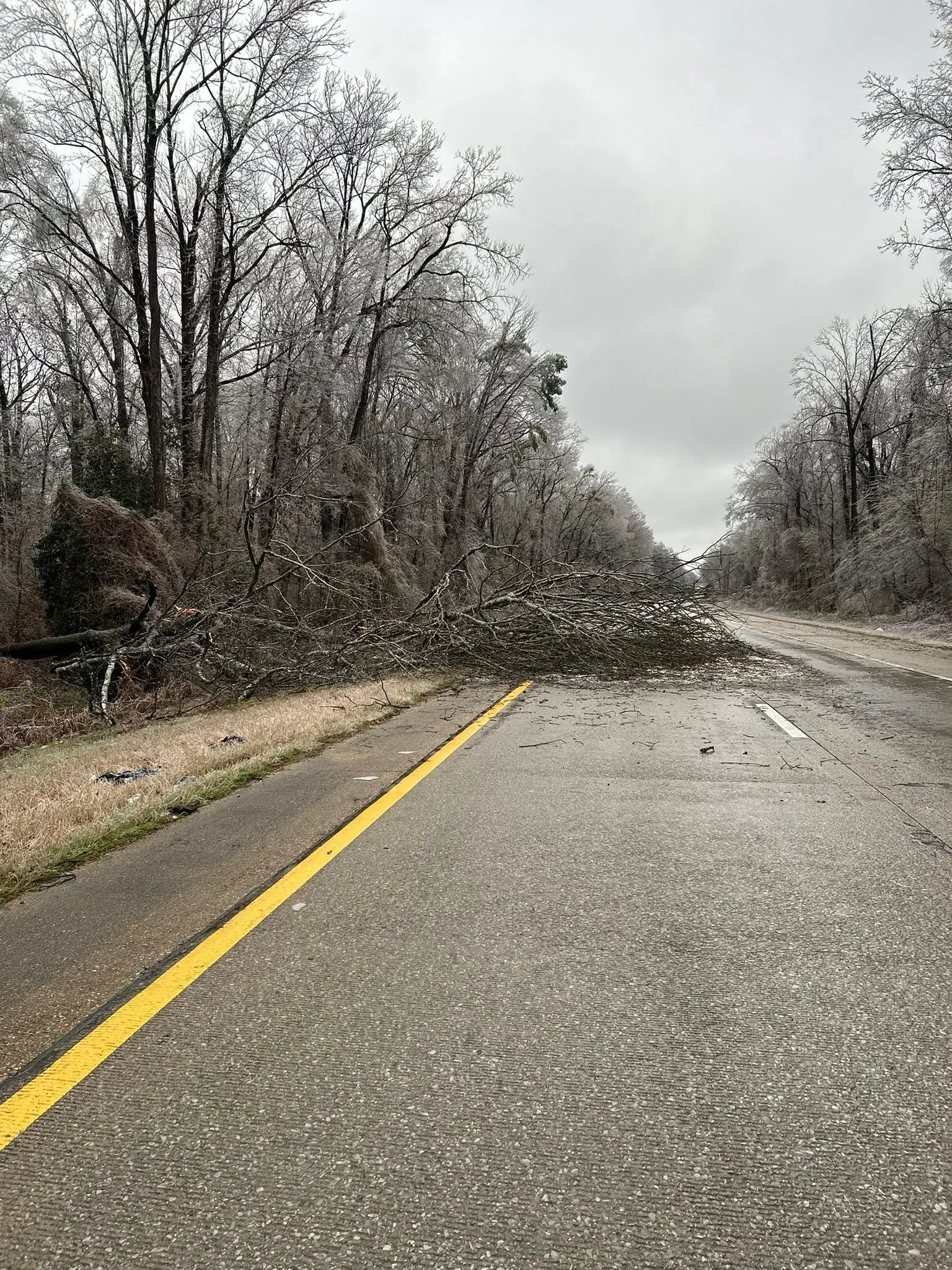 The Mississippi Highway Patrol reported downed trees and ice on Interstate 20 in Warren County in the western part of the state Sunday.