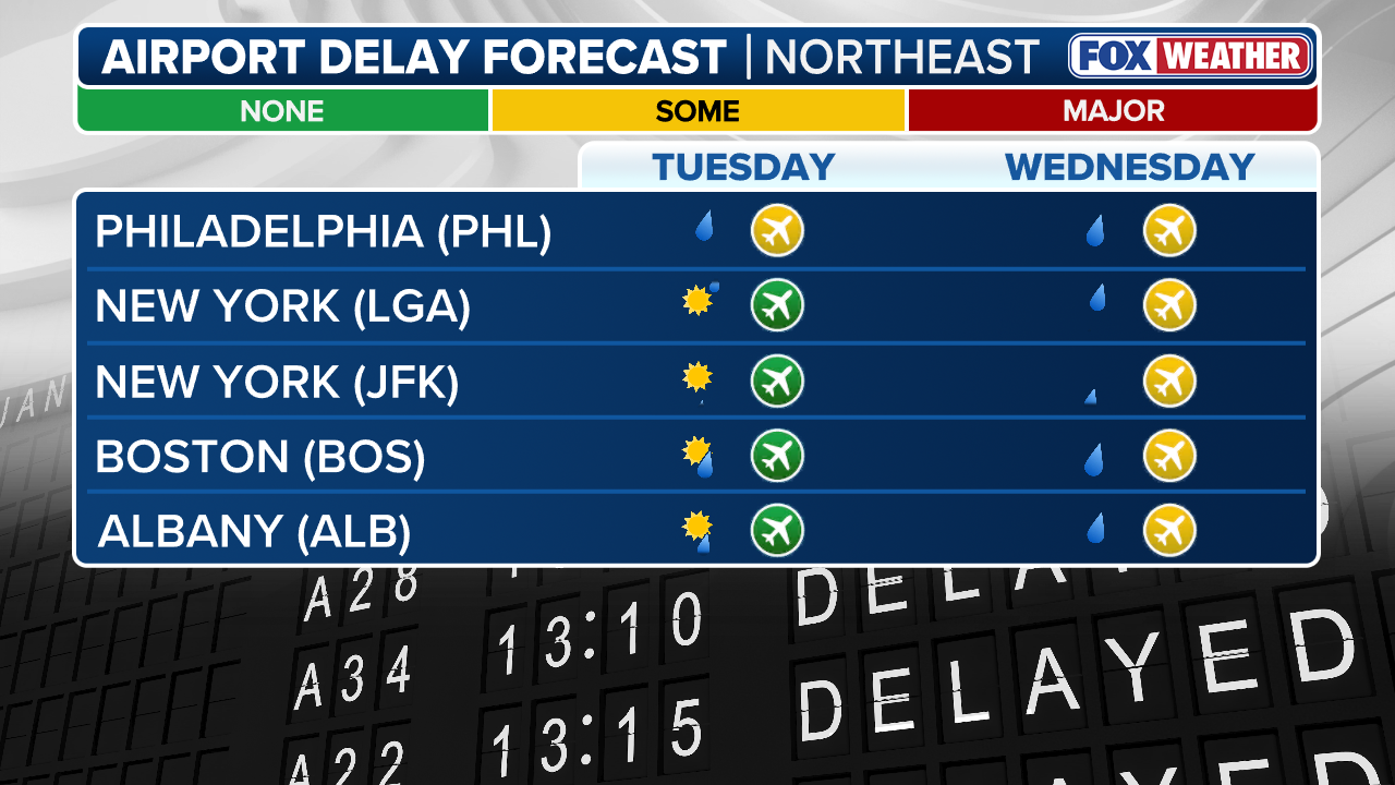 The cold front will bring periods of rain to the Northeast which could cause some delays to major airports in Boston, New York and Philadelphia, while some rain will linger across the Southeast and mid-Atlantic.