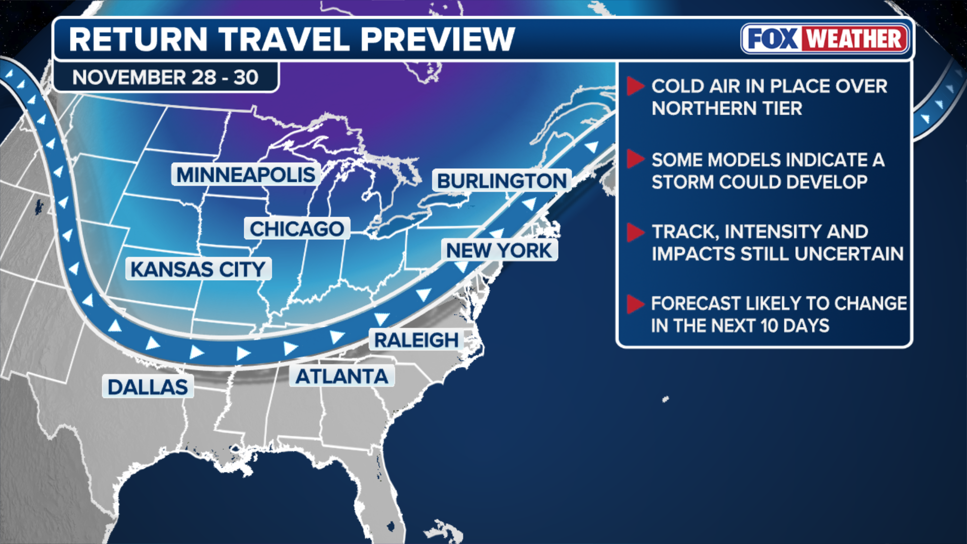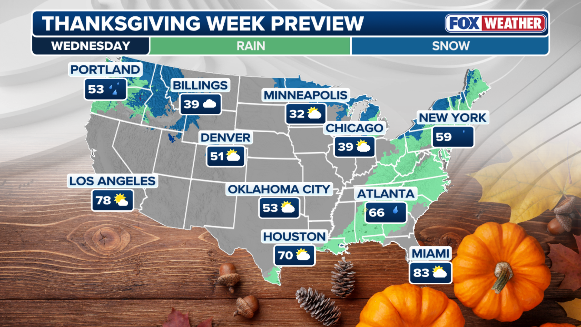 Meanwhile, a cold front will slide across the northern Tier on Wednesday, potentially bringing snow to Minnesota and rain to the Northeast, opening the door for potential delays at major airports in Boston, New York and Philadelphia, before most of the country dries out on Thanksgiving Day itself.