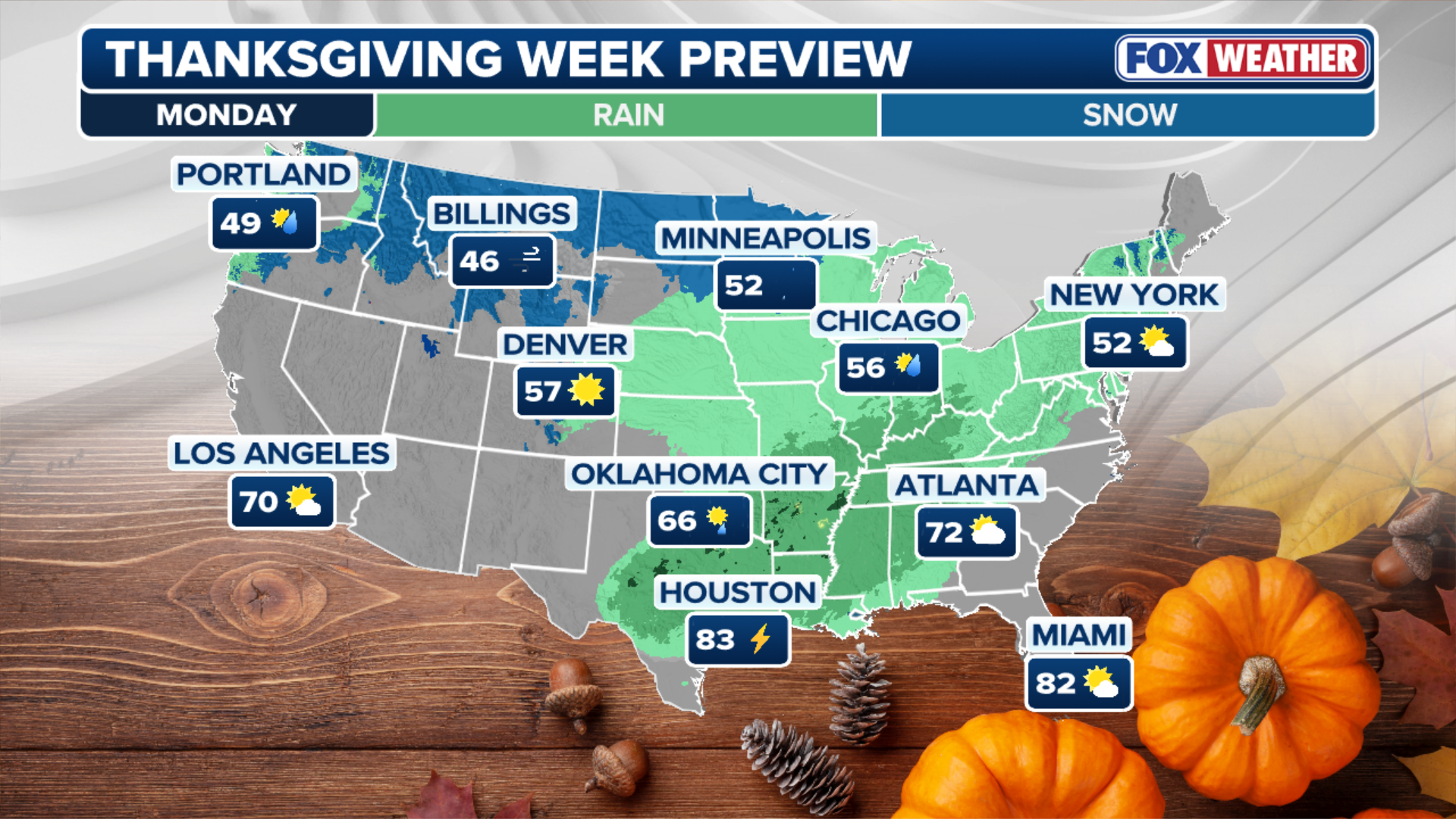Storms will bring heavy rain to Texas and the Southeast beginning Sunday night. Meanwhile, rain across the Northeast could delay travel on Wednesday with the possibility of snow in New York City on Thanksgiving Day itself.