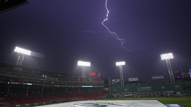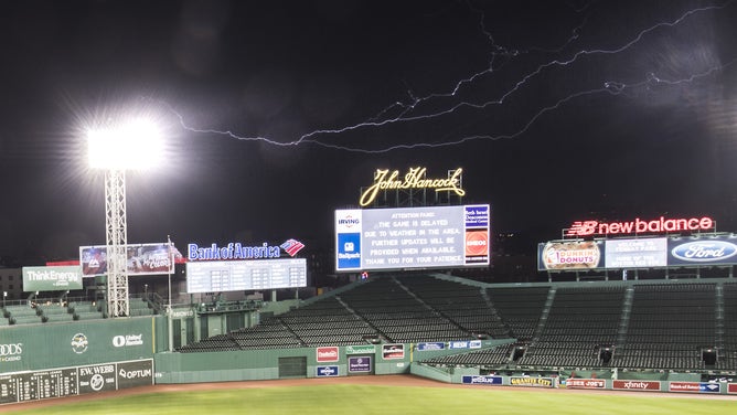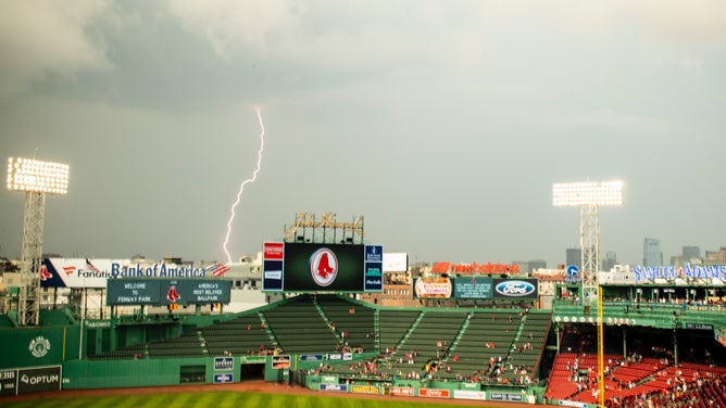 BOSTON - JUNE 27: A lightning bolt is seen over the bleachers during a rain delay. The Boston Red Sox host the Minnesota Twins in a regular season MLB baseball game at Fenway Park in Boston on Jun. 27, 2017. (Photo by Jim Davis/The Boston Globe via Getty Images)