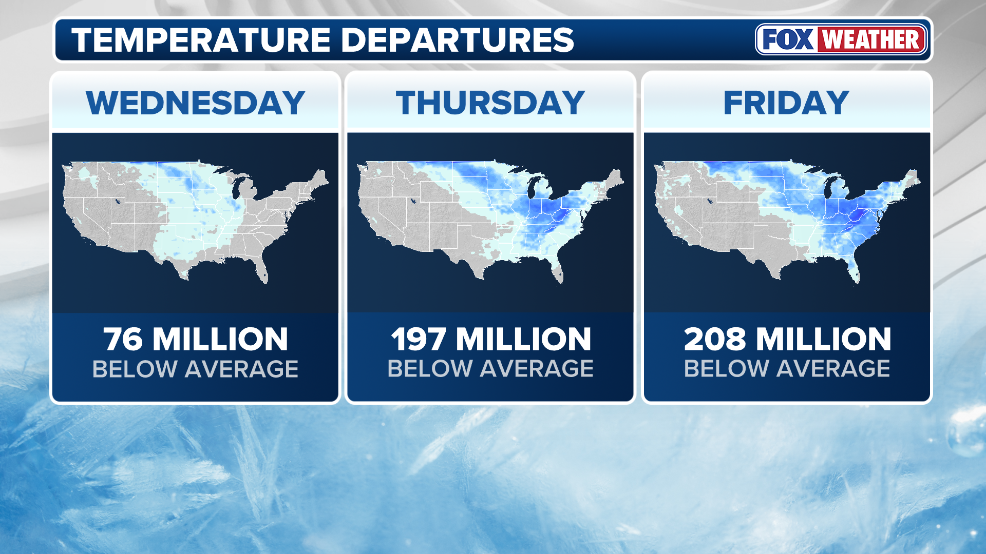 The cold air will expand east by Friday, with more than 200 million Americans experiencing below average temperatures from the Interstate 95 corridor in the Northeast to Northern Florida.