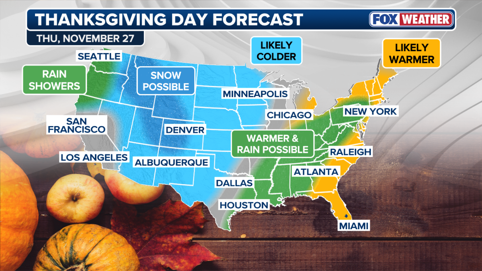 According to the FOX Forecast Center, an area from Missouri to Texas will likely see some rain on Wednesday into Thanksgiving Day, with the potential for snow where colder air is able to take hold.