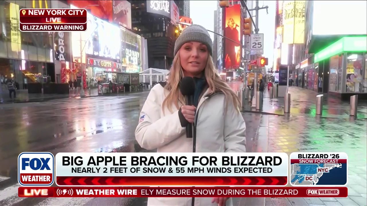 FOX Weather Meteorologist Haley Meier is live from Times Square, where rain is going to quickly give way to snow this afternoon—and by tonight, full blizzard conditions are expected. New York is under a State of Emergency as this marks the first blizzard in nearly a decade barreling in, threatening up to 2 feet of snow.