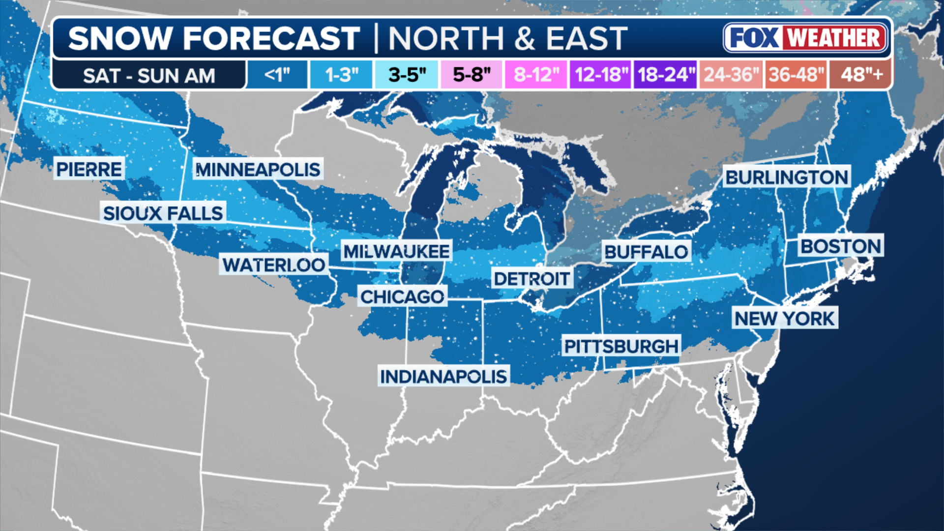 According to the FOX Forecast Center, snow will break out along the leading edge of cold air early Saturday across Montana and the Dakotas, before spreading to the Upper Midwest and Great Lakes by Saturday evening.