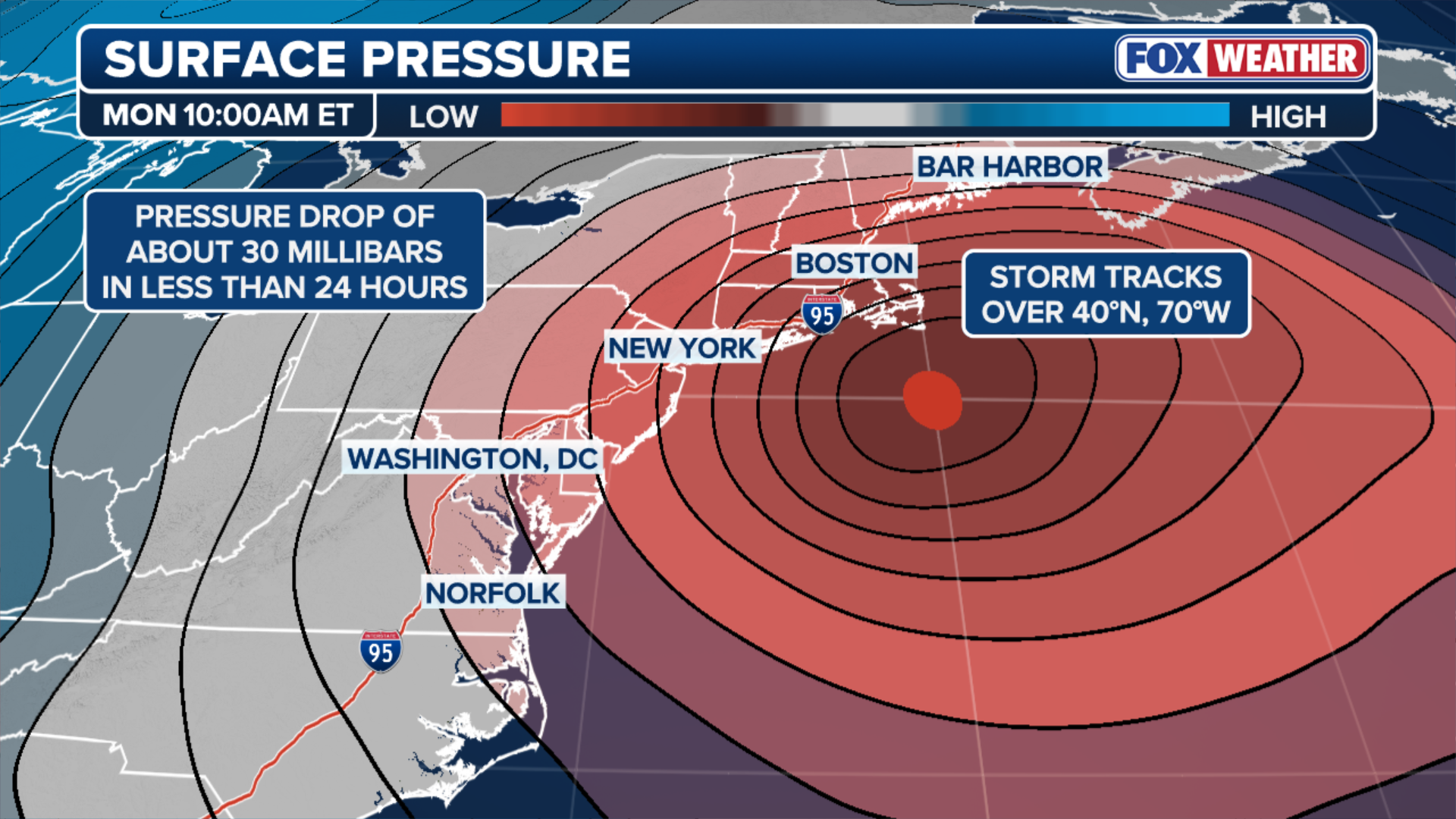 The storm will "bomb out" as the pressure drops more than 24 millibars in 24 hours and goes through bombogenesis.