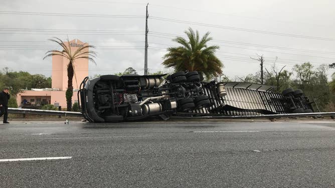 Photos show snapped trees, roof damage to homes, and at least one 18-wheeler knocked over by a severe storm.
