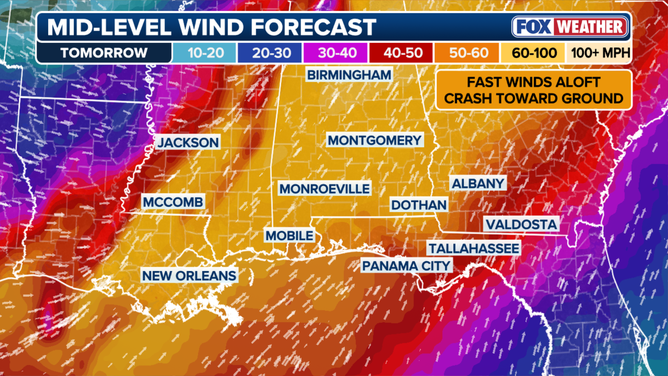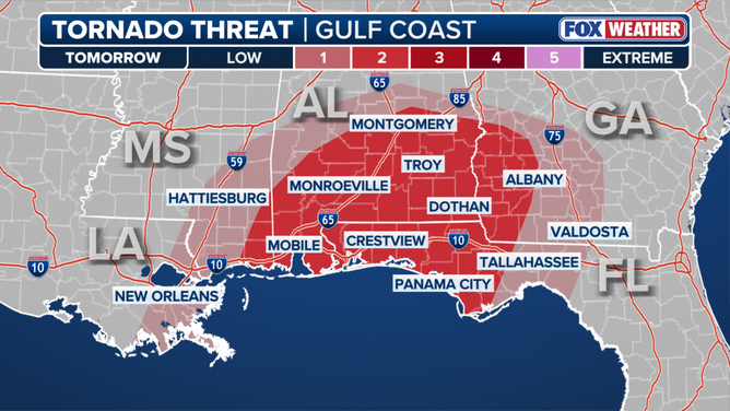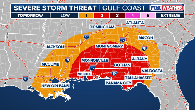 Southern portions of Mississippi, Alabama, Georgia and the Florida panhandle are under a Level 2 out of 5 threat. This includes Mobile and Montgomery, Alabama, Panama City, Florida, Albany, Georgia and more.