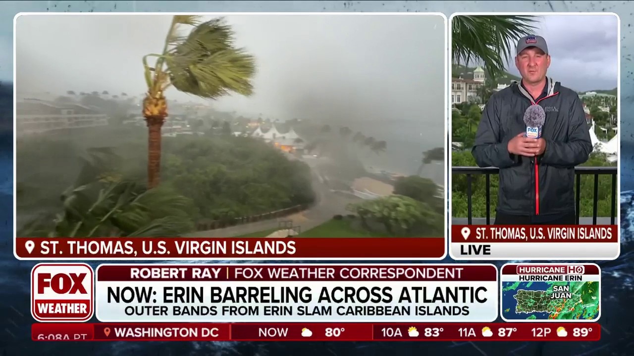 FOX Weather Correspondent Robert Ray shared this video of strong winds and heavy rain on St. Thomas in the U.S. Virgin Islands as Hurricane Erin passed to the north on Saturday, Aug. 17, 2025.