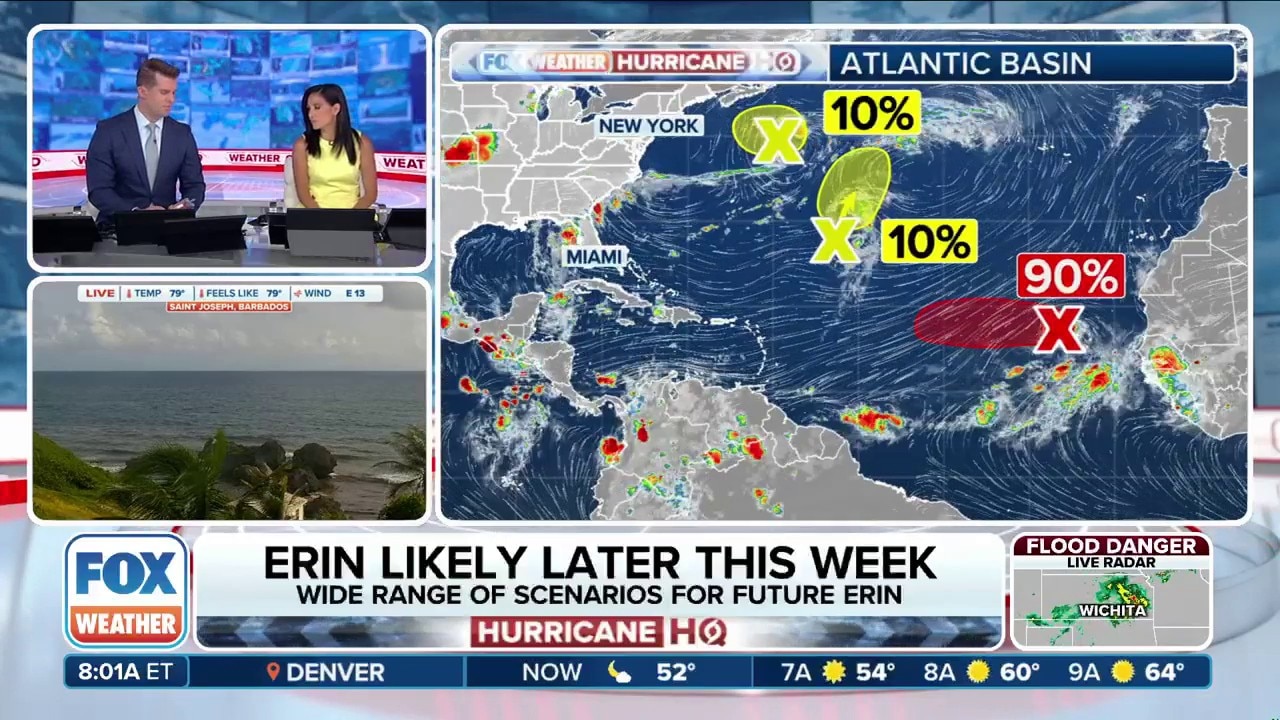 The development chances for Invest 97L are continuing to increase, and forecasters now say Tropical Depression Five or Tropical Storm Erin could form as soon as Monday. FOX Weather Meteorologists Stephen Morgan and Marissa Torres have the latest forecast on Aug. 11, 2025.