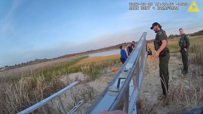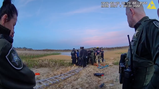Video released from the sheriff's office shows the man covered up to his shoulders in mud, and he had sunk below the level of the grass surrounding the borrow pit, making him virtually camouflaged, according to officials.