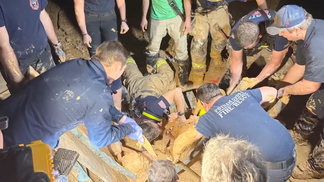 Several fire and rescue crews tried to drag the man out of the mud using ropes, but were unsuccessful. Then, rescuers brought in ladders and other supplies to safely dig him out.