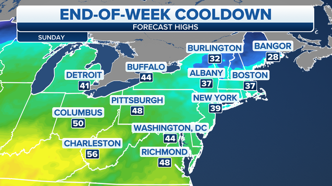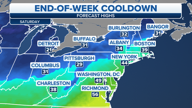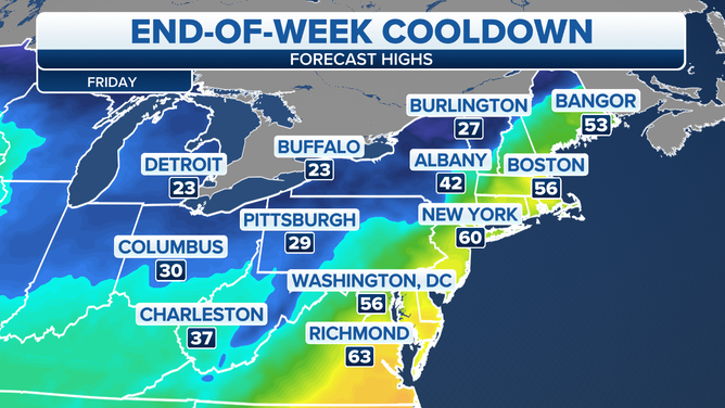 By Saturday, Bangor, Maine, will be back below freezing. Boston, which will get to around 55 degrees Friday, will plummet to 39 degrees on Saturday.