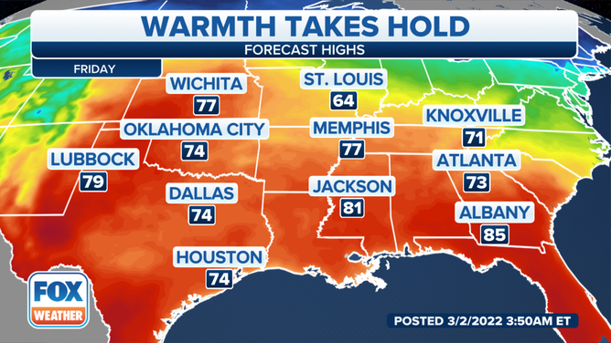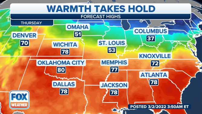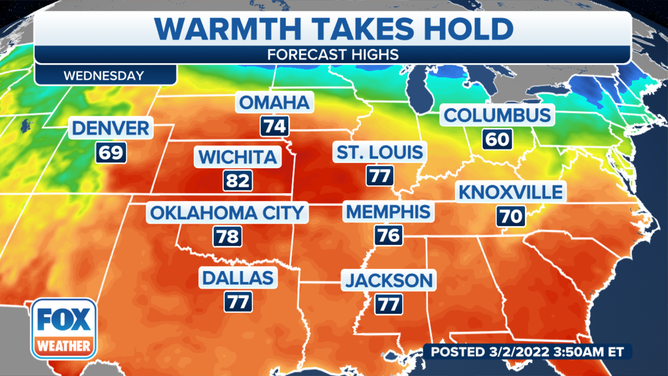 Lubbock, Texas, and Wichita will be in the upper 70s, while to the north in Omaha, Nebraska, it will only get to about 71 degrees.