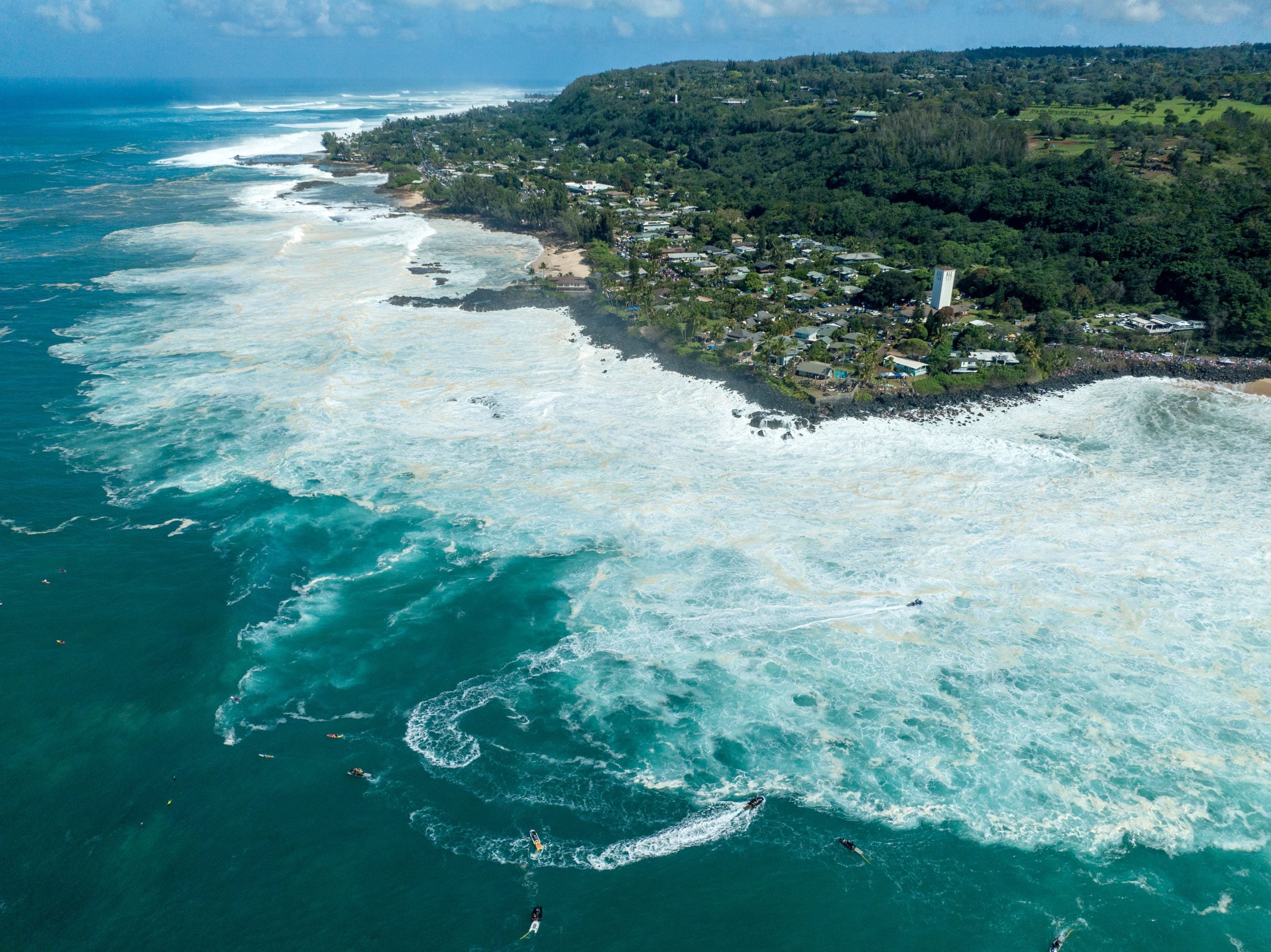 An aerial view of jet skis and safety patrol going to to pull surfers out of the white water after a closeout set during the Eddie Aikau Big Wave Invitational on January 22, 2023 in Waimea Bay, Haleiwa, Hawaii.