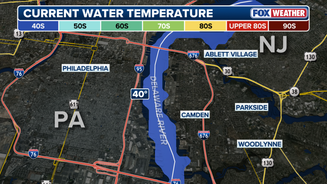 Water temperatures are approximately 40 degrees in the Delaware River, according to a NOAA Buoy near Camden.