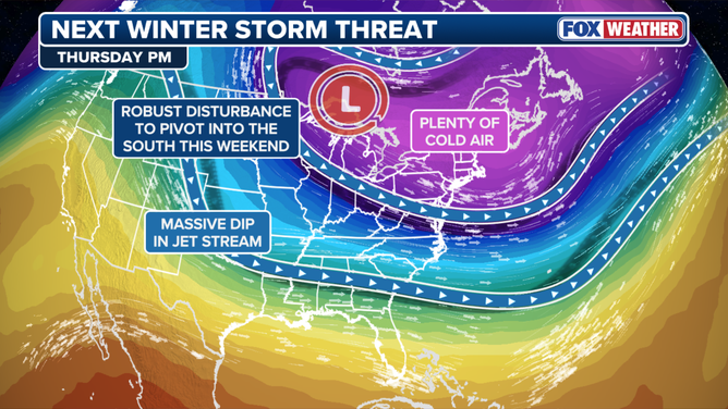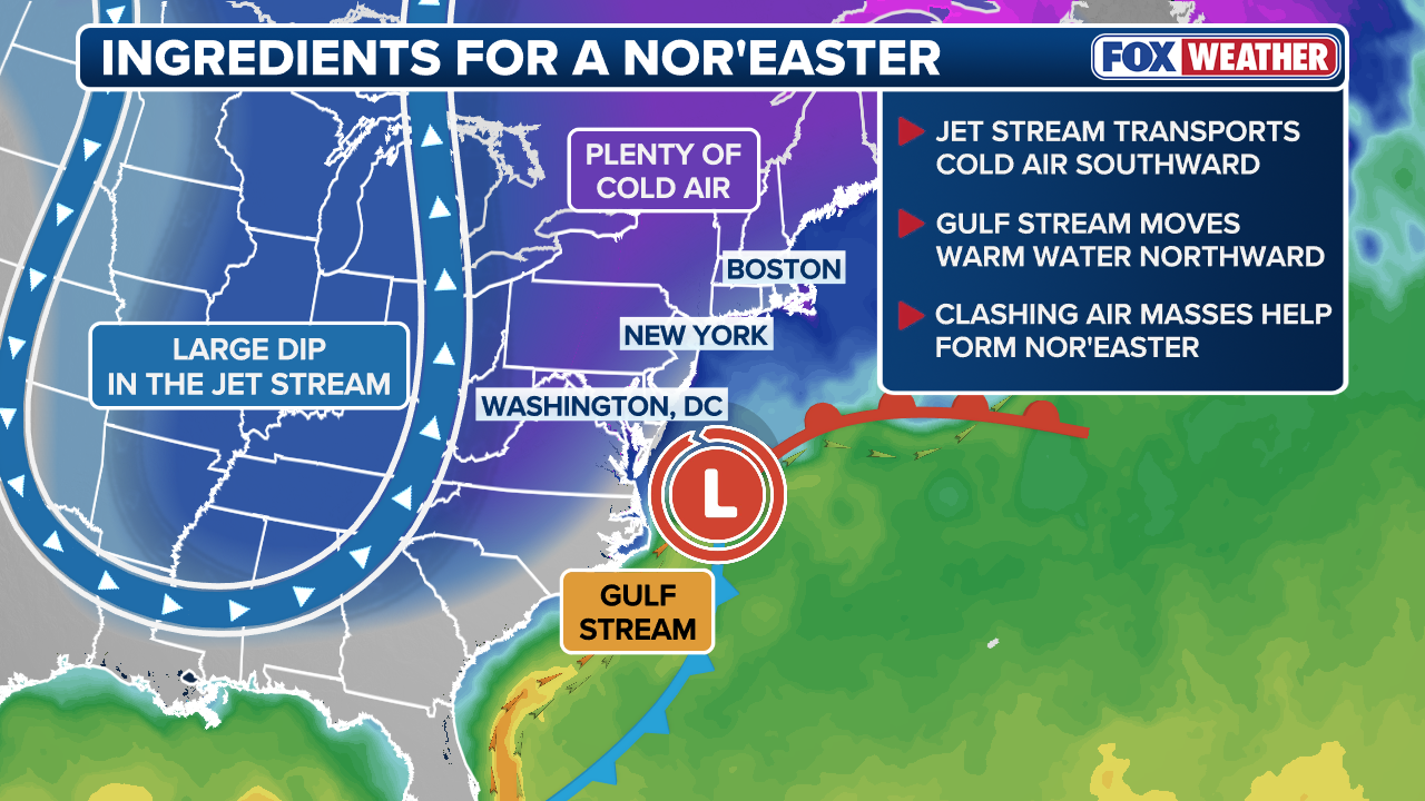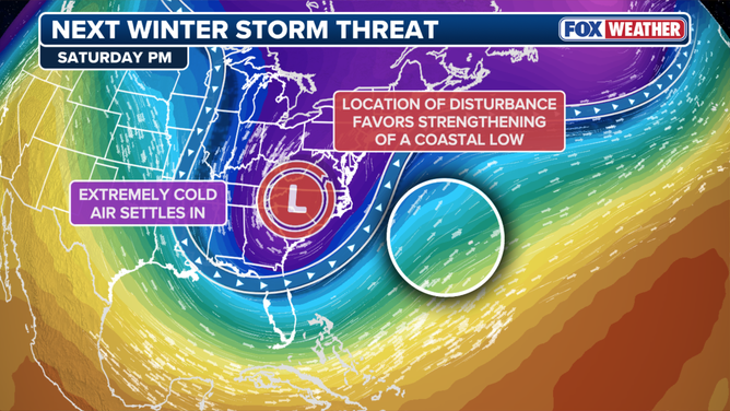 With a pronounced dip in the jet stream reinforcing cold air and suppressing the storm's track farther south, a strong upper-level disturbance is expected to become embedded within the jet stream late in the week that could set the stage for the key ingredient: the development of an area of low pressure off the East Coast.