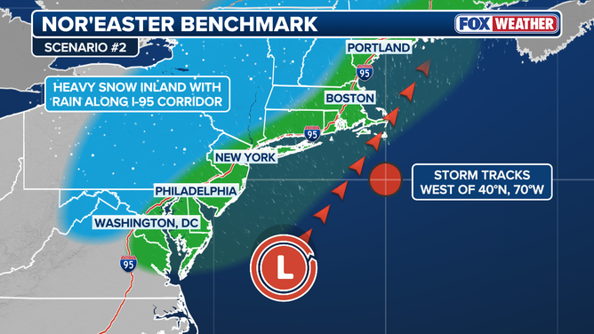 In this scenario, the storm tracks closer to the East Coat, which would bring rain to the I-95 corridor while producing heavy snow inland.