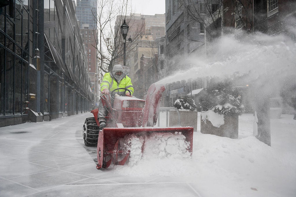 A worker clears snow off a sidewalk in Philadelphia, Pennsylvania, on January 25, 2026.