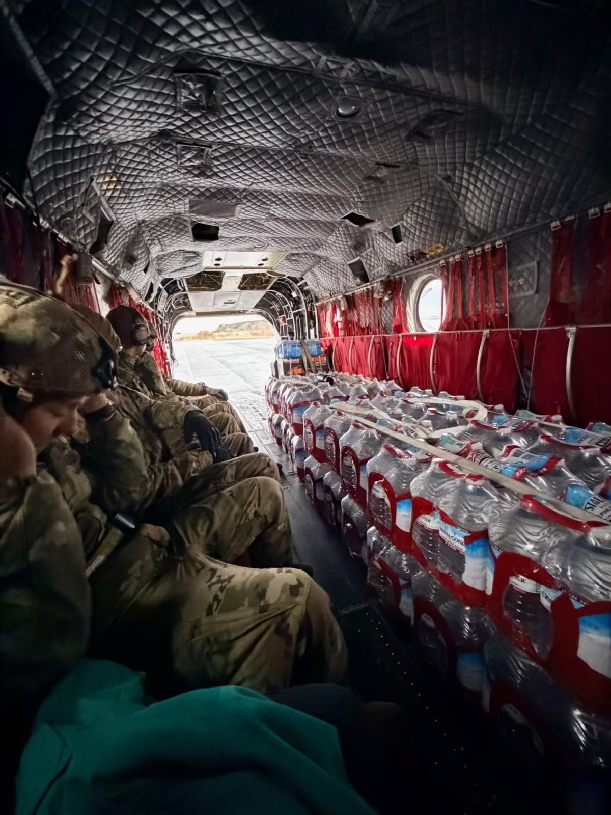Photos from the Alaska Division of Homeland Security showed water and other key supplies flown to Kipnuk by Chinook helicopters Wednesday.
