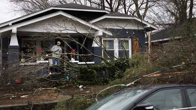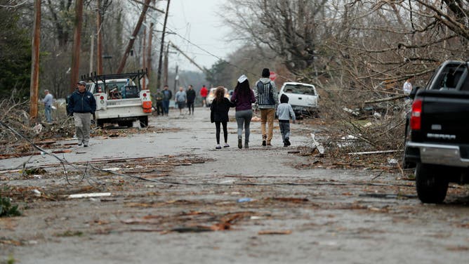 Bowling Green, Kentucky, residents look at the damage following a tornado that struck the area on December 11, 2021. - Tornadoes ripped through five US states overnight, leaving more than 70 people dead Saturday in Kentucky and causing multiple fatalities at an Amazon warehouse in Illinois that suffered "catastrophic damage" with around 100 people trapped inside. The western Kentucky town of Mayfield was "ground zero" of the storm -- a scene of "massive devastation," one official said. (Photo by Gunnar Word / AFP) (Photo by GUNNAR WORD/AFP via Getty Images)