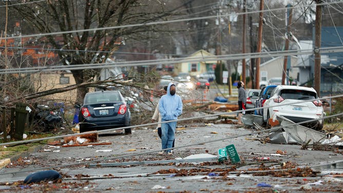 TOPSHOT - A Bowling Green, Kentucky, resident surveys the damage following a tornado that struck the area on December 11, 2021. - Tornadoes ripped through five US states overnight, leaving more than 70 people dead Saturday in Kentucky and causing multiple fatalities at an Amazon warehouse in Illinois that suffered "catastrophic damage" with around 100 people trapped inside. The western Kentucky town of Mayfield was "ground zero" of the storm -- a scene of "massive devastation," one official said. (Photo by Gunnar Word / AFP) (Photo by GUNNAR WORD/AFP via Getty Images)