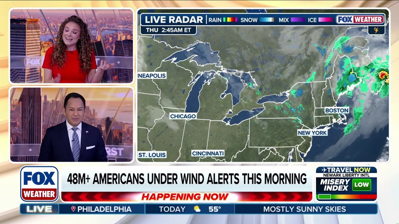Strong wind gusts of 50-70 mph were recorded across the Northeast as fast-moving area of low pressure, known as a clipper, raced through the region. Some wind alerts remain through Thursday morning and more than 70,000 customers were without power across Pennsylvania, Maryland, New Jersey and New York.
