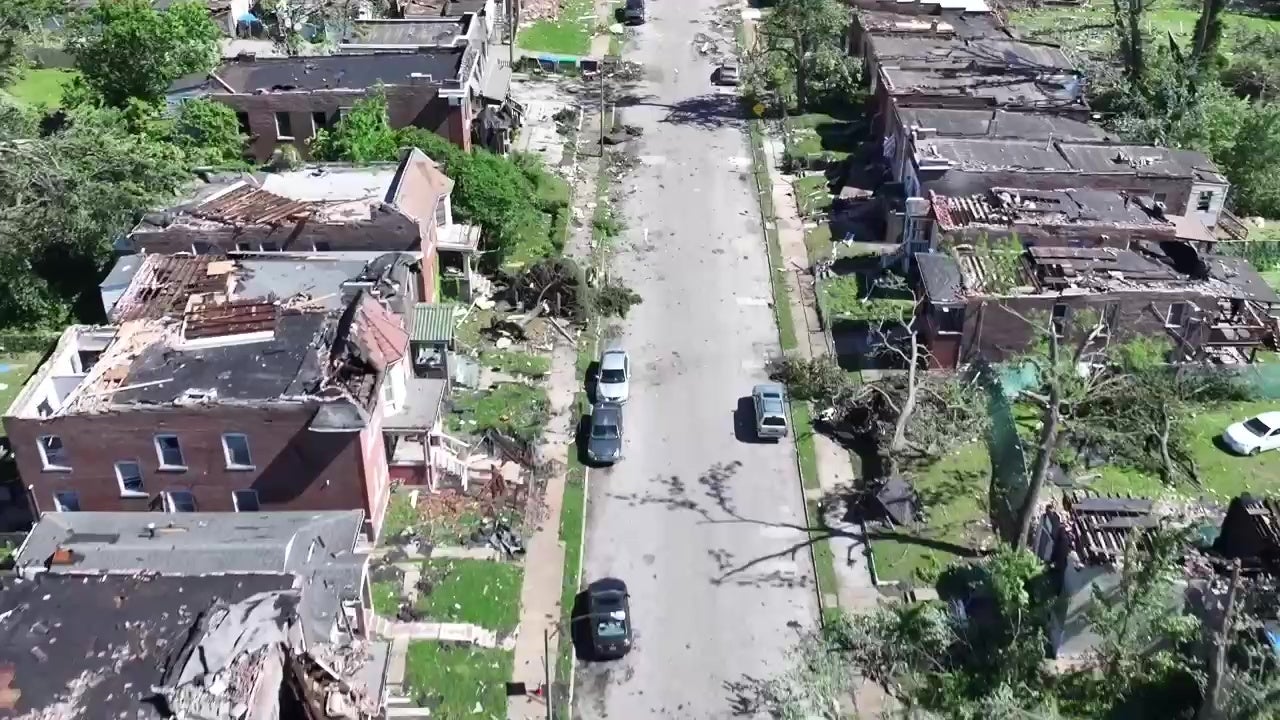 Aerial footage of tornado damage in St. Louis